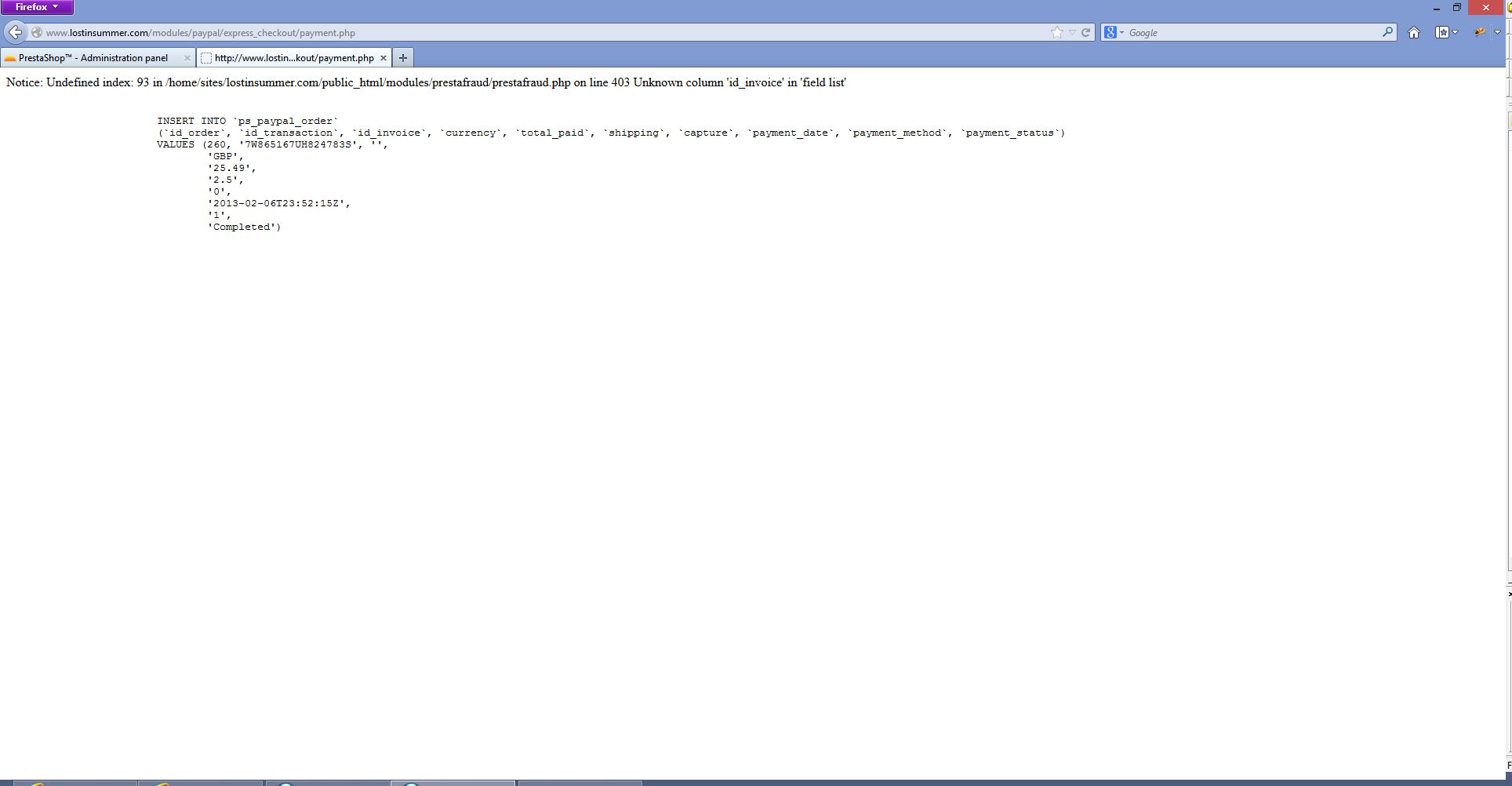 simonlostinsummer Posted February 11, 2013 Share Posted February 11, 2013 Hi I am using prestashop 1.4.5.1 and recently installed the update to Paypal in order to utilise the Mobile Template module. When testing the new Paypal module I placed an order, after I placed an order I was taken to Paypal, which then says click confirm order on my shop. When I clicked to confirm this I was sent to a blank page with the following error message: Notice: Undefined index: 93 in /home/sites/lostinsummer.com/public_html/modules/prestafraud/prestafraud.php on line 403 Notice: Undefined offset: 7 in /home/sites/lostinsummer.com/public_html/modules/prestafraud/prestafraud.php on line 412 Unknown column 'id_invoice' in 'field list' INSERT INTO `ps_paypal_order` (`id_order`, `id_transaction`, `id_invoice`, `currency`, `total_paid`, `shipping`, `capture`, `payment_date`, `payment_method`, `payment_status`) VALUES (256, '7PF04933DD300333Y', '', 'GBP', '3.99', '2.5', '0', '2013-02-06T00:48:44Z', '1', 'Completed') Can you please help? What do I need to amend? It appears that when I installed the latest Paypal it did not update the ps_paypal_order db table to include the new necessary table columns - I cannot be the only person that this has effected, can someone please advise me what to do to rectify the situation Thanks in advance Simon Link to comment Share on other sites More sharing options...