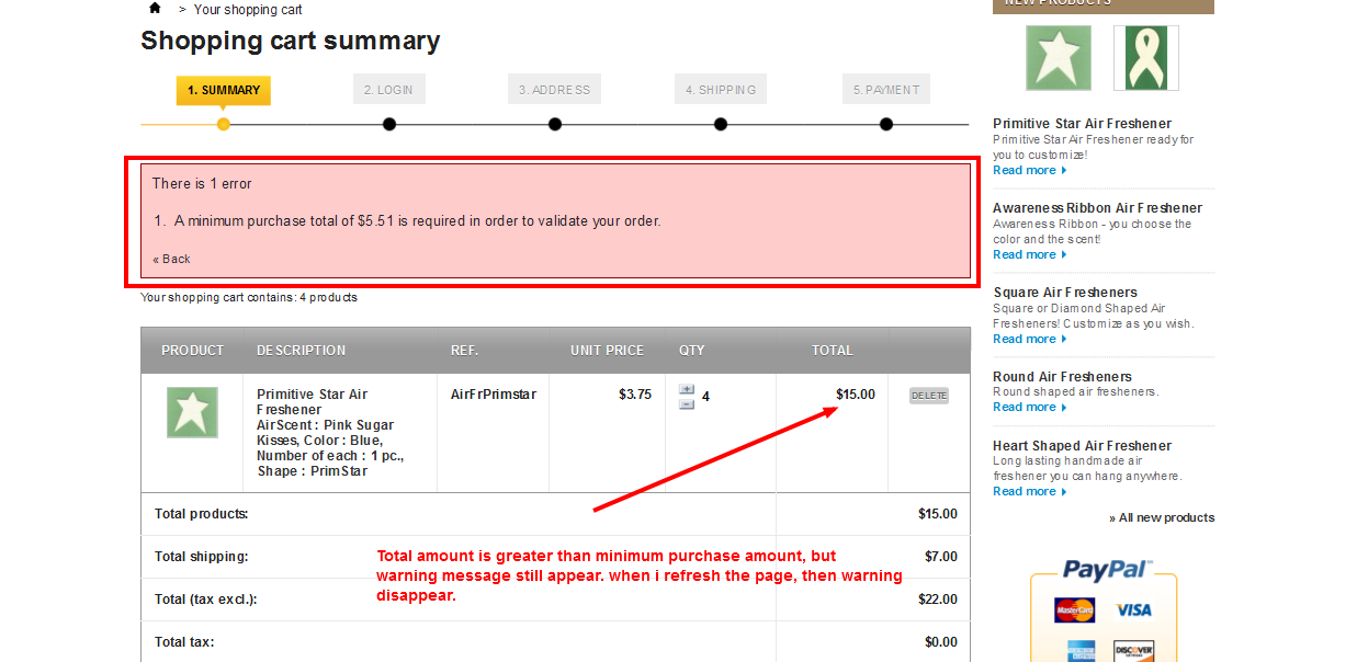 kashifkhan112 Posted February 12, 2013 Share Posted February 12, 2013 A minimum purchase total amount warning not disappearing if total price is greater than defined minimum purchase amount This warning only disappear when i refresh the page, anyone has notice about this bug. Please find attachment. Link to comment Share on other sites More sharing options...