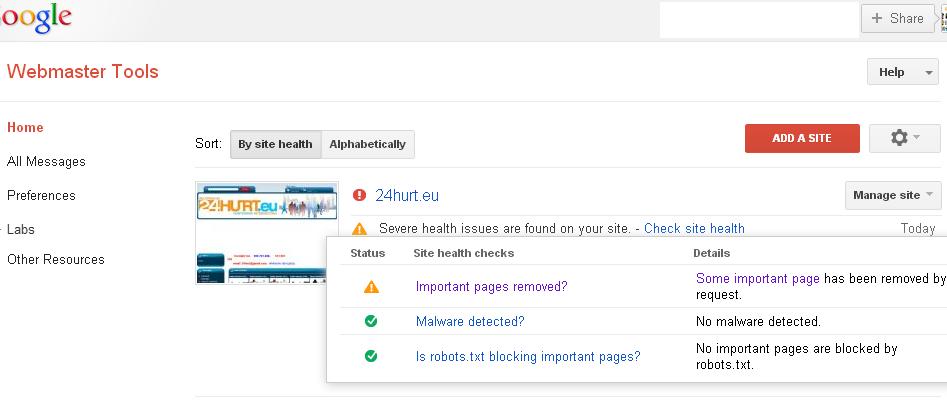 rakepl Posted February 12, 2013 Share Posted February 12, 2013 Hi everyone, My eshop http://24hurt.eu is running on PS 1.3.1.1, and don't use any tricks or module to improve ranking on google, and often remove error links crawl by Google bots. Yesterday customers called and informed us that they couldn't find us on internet, after checking, sadly said it's true and in google webmaster tools there is a message: Status Site health checks Details Important pages removed? Some important page has been removed by request. Please help or give me an advice, because the shop is very important to me but I don't know how to do in this case. In HTML Improvements on google webmaster tools, we got alot of duplicate content even use module Duplicate URL Redirect Thank you very much. Link to comment Share on other sites More sharing options...