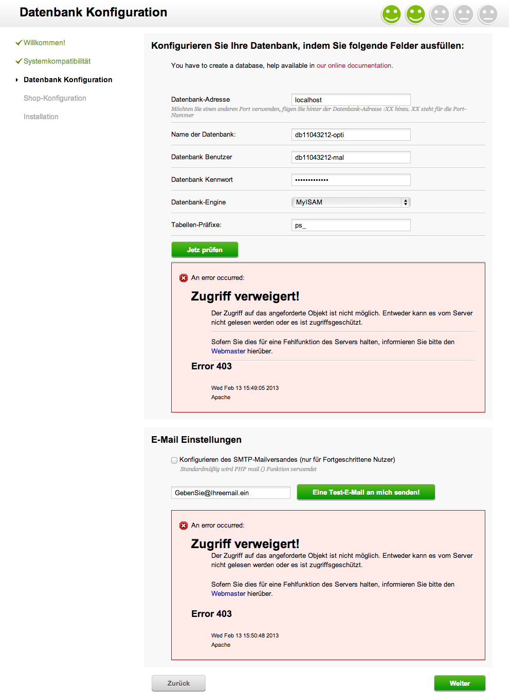 Dein Server verweigert den Zugriff auf die Datenbank und auf den Mailserver. Hier findest du die Mindestanforderungen für deinen Server, um PS 1.5. installieren zu können.