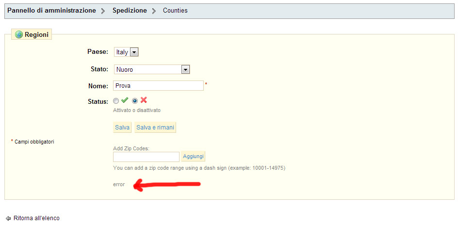 websign Posted February 14, 2013 Share Posted February 14, 2013 Salve a tutti, avrei bisogno di un piccolo aiuto circa un problema che sto incontrando su una installazione di prestashop (versione 1.4.9). Nel gestionale, sezione "Spedizione", sottosezione "Countries", sto cercando di aggiungere una nuova "Regione" alla quale associare determinati cap. La creazione della regione va a buon fine. Quando poi entro nuovamente nella specifica regione per aggiungere un cap ottengo un messaggio di errore in fase di inserimento. La regione è associata al paese Italia in cui il formato del cap è correttamente settato su NNNNN. Io provo ad inserire un cap tipo 08040 (è un cap reale), ma ricevo come risposta "Error" subito sotto il form di inserimento cap. Allego uno screenshot del problema. Ringrazio chiunque sappia darmi una mano... non riesco a capire da cosa possa dipendere Link to comment Share on other sites More sharing options...