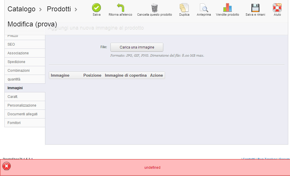 Alessandro-Car Posted February 14, 2013 Share Posted February 14, 2013 Ciao a tutti Ho appena installato prestashop. Quando vado in immagini e carico un'immagine sotto mi compare una striscia rossa con scritto undefined Cosa posso fare? Ho già i permessi 777. Link to comment Share on other sites More sharing options...