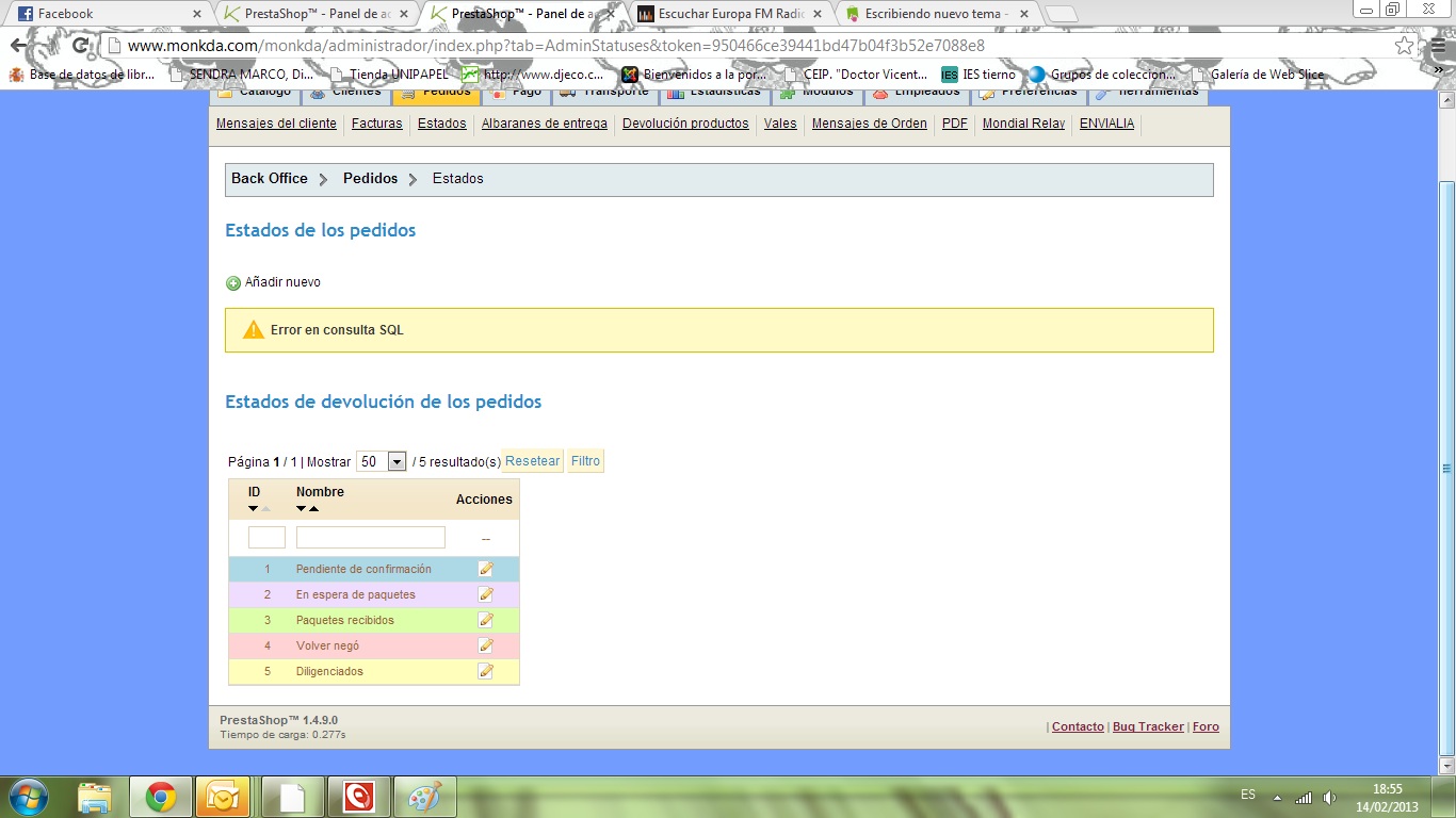 jesa Posted February 15, 2013 Share Posted February 15, 2013 El error parece bastante claro, tu problema está en que no los puede recuperar de la base de datos. Con los pantallazos que has puesto y las explicaciones que das, no se puede ayudar mucho más. Yo te diría que miraras si has añadido algo nuevo en la tienda que pueda estar creando un conflicto con los estados. Para poder ayudarte mas concretamente habría que saber que sql está fallando y a partir de ahí ver porque. Link to comment Share on other sites More sharing options...