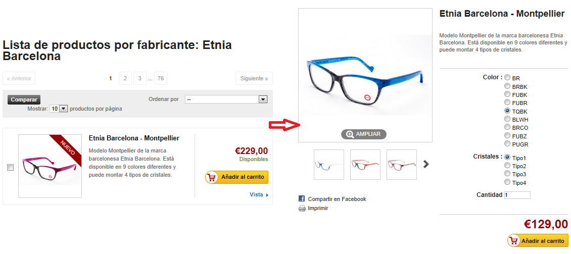 Serex Posted May 17, 2013 Share Posted May 17, 2013 En el listado de productos que precio te muestra? El que tienes definido para el producto o el de una combinacion con el impacto correspondiente? Usas el tema por defecto de prestashop? Hola! El producto tiene, más o menos, esto: Precio base: 129,00€ Combinaciones de color (9): sin impacto (129,00€ independiente del color seleccionado) Combinación segundo atributo: Valor1: sin impacto, Valor2: 50€ impacto, Valor3: 75€ impacto, Valor4: 100€ impacto Con ello, independientemente del color seleccionado, el precio será: - Con Valor1: 129,00€ - Con Valor2: 179,00€ - Con Valor3: 204,00€ - Con Valor4: 229,00€ En la ficha de producto, nada más entrar, me muestra la combinación por defecto a 129,00€ (correcto), pero en el listado de productos de la marca me sale a 229,00€. Lo suyo es que saliera ahí "129,00€" o, al menos, "desde 129,00€". En las capturas que adjunto se puede ver como sale en el listado al seleccionar la marca (parte izquierda) y como sale nada más entrar en la ficha del artículo (parte derecha). El tema es que en la de la parte izquierda saliera 129,00€ y no 229,00€. ¿Algún consejo? PD: La tienda está en desarrollo todavía, por lo que los precios, obviamente, no son reales ;-) Link to comment Share on other sites More sharing options...