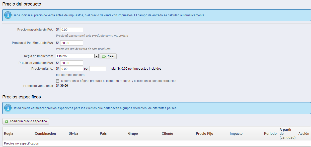yompiam Posted February 15, 2013 Share Posted February 15, 2013 (edited) Buen Día. Amigos, podrían ayudarme a dar solución a este problema ya que he configurado y re configurado "preferencias/productos" Preferencias pedido" "localizacion/impuestos" "localizacion/reglas" y no logro sacar el calculo que hace al confirmar compra. El producto en tienda Front Office se muestra sin el IGV. y cuando agrego este producto al carrito, muestra, este calculo: y en "catalogo/producto/precio" tengo deshabilitado el IGV incluido. Ayúdenme por favor a darle soluciones gracias. Edited February 20, 2013 by yompiam (see edit history) Link to comment Share on other sites More sharing options...