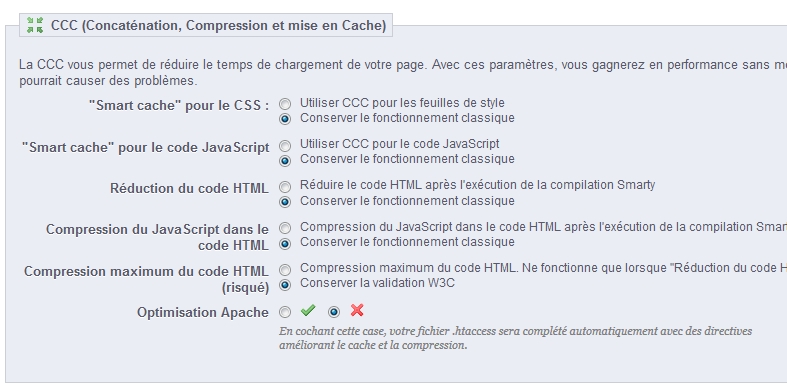 Bondaty and Co Posted July 3, 2013 Share Posted July 3, 2013 Bonjour, Désolé de détérrer ce sujet mais sous prestashop 1.5 cette option n'y est plus, auriez vous une idée de commanent corriger un bug présent uniquement sur IE ? Merci Cette option est toujours présente sur la 1.5 dans paramètres avancés -> performances Link to comment Share on other sites More sharing options...