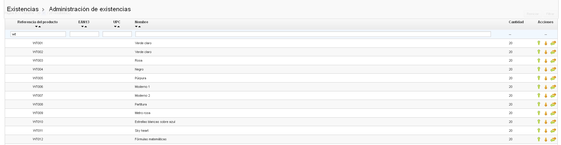 brz Posted February 16, 2013 Share Posted February 16, 2013 (edited) Buenas tardes! dentro de poco voy a abrir una tienda online y estaba configurando el uso avanzado de stock, metiendo cantidades y todo eso... el problema es que al entrar en administrador de existencias, el listado contiene algún error. Si veis la imagen adjunta, aparece una porción (no he puesto toda porque ocuparía mucho y tampoco aporta más, pues el error está al comienzo) con parte de un listado... con el primer elemento duplicado ¡Pero solo el nombre! es decir, en la primera columna los códigos se muestran los que son, pero en el nombre el primero elemento aparece duplicado y desplaza el resto hacia abajo. Es decir, las dos primeras referencias tienen el mismo nombre, la tercera aparece con el nombre del segundo, la cuarta con el del quinto... no se si se entiende. Los demás datos del listado están bien, las cantidades mostradas para cada referencia son correctas, lo que está mal es el nombre y eso lo hace confuso de gestionar. El producto con referencia WT001 es el Verde Claro, el WT002 el rosa, WT003 el negro... y en el listado aparecen WT001 y WT002 con Verde Claro, WT003 Rosa... etc.Y el último elemento de la lista aparece con el nombre del penúltimo y no puedes saber cual salvo que entres a editar. es bastante molesto porque debes andar pensando que al cantidad mostrada en una fila del listado en realidad se corresponde al nombre del anterior elemento de la lista... Además cuando le das a cambiar cantidad aparece el elemento correcto (coincide con la referencia del listado, pero no con el nombre) ¿A alguien más le ha pasado? Muchas gracias. Saludos PD: Me acabo de dar cuenta de una cosa... creo que ya se lo que pasa. Todos estos productos, al ser del mismo tipo que el anterior pero cambiando solo el color, le di a "duplicar producto" a la hora de crearlo ¿puede ser por eso? ¿Y donde está esa información guardada? No la coge del producto porque ya tiene toda al información cambiada con respecto a la clonación... Si es por eso ¿Se puede editar esa información en algún lado? Edited February 16, 2013 by brz (see edit history) Link to comment Share on other sites More sharing options...