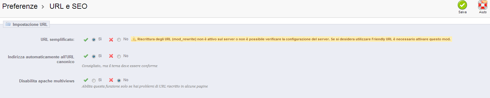 dvanet Posted March 3, 2013 Share Posted March 3, 2013 Salve a tutti, Come preannunciato sul titolo, mi rivolgo a coloro che, come me, sono utenti di aruba, spazio linux (PHP 5.3.19). Ho notato che in corrispondenza della scheda che imposta l'attivazione del SEO, url brevi, al lato della casella di spunta, mi compare il messaggio di attenzione "Riscrittura degli URL (mod_rewrite) non è attivo sul server o non è possibile verificare la configurazione del server...." , mentre le url brevi sono correttamente funzionanti. Altro messaggio di attenzione mi compare nella scheda di 1click autoupgrade. nella sezione "confronto tra le versioni" trovo il messaggio: "PrestaShop versione originale: Error Unable to check md5 files <<<<< questo è il messaggio... differenze tra le versioni:" e non vengono elencate le differenze delle versioni, in questo caso l'autoupgrade non funziona e devo farlo in locale e ricaricarlo. La stessa istallazione, in locale, non mostra questi messaggi di attenzione. Invece per la scheda 1click autoupgrade...non l'ho nemmeno mai vista. io uso ps 1.5.3 ciao daniele Ero curioso di sapere se questa particolarità è comune ad altri utenti e se si può correggere. Ciao,ti rispondo anche io dopo aver contattato più volte aruba. anche a me in preferenze seo...compare la stessa scritta. ho chiamato e lasciato i codici per entrare nel sito e fare un test. ancora nessuna risposta. appena so qualcosa ...condivido. Link to comment Share on other sites More sharing options...