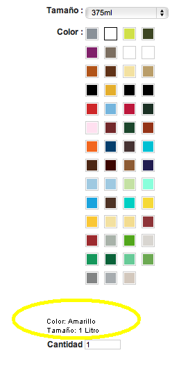 Me gustaría que el nombre de cada Color (Azul, Amarillo, Rojo) aparezcan en la ficha del producto cuando seleccionemos cada color al igual que se ve la el Nº de Referencia que va cambiando dependiendo de cada Color y cada Cantidad.