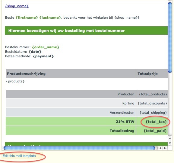 scorpionsworld Posted February 28, 2013 Share Posted February 28, 2013 (edited) Klopt, er heeft iemand aangezeten die niet voldoende kennis van zaken had. Maar ik moet het nu alleen doen. Misschien kun je nog even helpen. Moet ik de wijziging v.w.b. de BTW in het Emailtemplate doorvoeren of in het HTML-bronbestand? Voor mijn gemaak heb ik er alvast een rode ovaal omheen getrokken. Alvast bedankt voor alles Ik heb het even tegen de default nl mailtemplate aangelegd. De total_tax variabele is niet standaard. Tenzij er een override is gemaakt op de PaymentModule class om de total_tax variabele op te vullen met een waarde gaat die regel sowieso niet werken.Welke methode je daarna gebruikt om de wijziging door te voeren maakt dan niet uit. Voor het gemak zou ik het dan via de BO vertalingen doen. Edited February 28, 2013 by scorpionsworld (see edit history) Link to comment Share on other sites More sharing options...