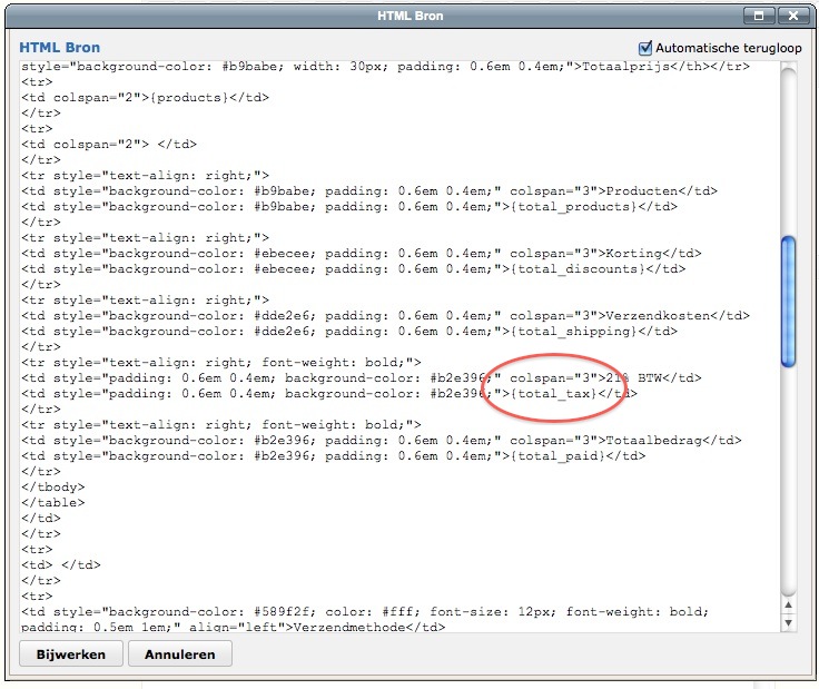 arthouse Posted February 28, 2013 Author Share Posted February 28, 2013 Klopt, er heeft iemand aangezeten die niet voldoende kennis van zaken had. Maar ik moet het nu alleen doen. Misschien kun je nog even helpen. Moet ik de wijziging v.w.b. de BTW in het Emailtemplate doorvoeren of in het HTML-bronbestand? Voor mijn gemaak heb ik er alvast een rode ovaal omheen getrokken. Alvast bedankt voor alles Link to comment Share on other sites More sharing options...