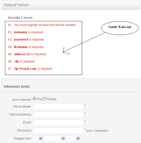 BungaMawar Posted February 24, 2013 Share Posted February 24, 2013 (edited) Haloo.. semua, saya mau ganti kata" pendaftaran yang tidak di isi ... akan tampil error, itu gantinya di bagian mana ya semua.... ini adalah bahasa inggris... saya mau ganti dengan kata" lain atau ganti dengan bahasa lain, lihat gambar di bawah ... Terima kasih ... Edited February 24, 2013 by BungaMawar (see edit history) Link to comment Share on other sites More sharing options...
