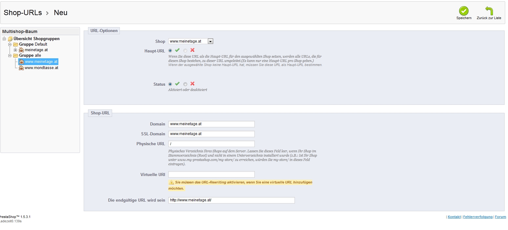 Feetschi Posted February 25, 2013 Author Share Posted February 25, 2013 Ich hab jetzt eine neue Gruppe angelegt, damit ich alle Shopgruppen-Eigenschafte auf aktiv stellen kann. Dort hab ich jetzt alle zwei Domains angelegt, aber wenn ich dann eine URL hinzufügen wil, dann bekomm ich folgende Meldung: "Beim Erstellen des Objekts ist ein Fehler aufgetreten shop_url (Duplicate entry 'www.meinetage.at-/-' for key 'full_shop_url')" Ich hab die Anleitung zweimal durchgelesen,aber irgendwas muss ich missverstehen. Link to comment Share on other sites More sharing options...