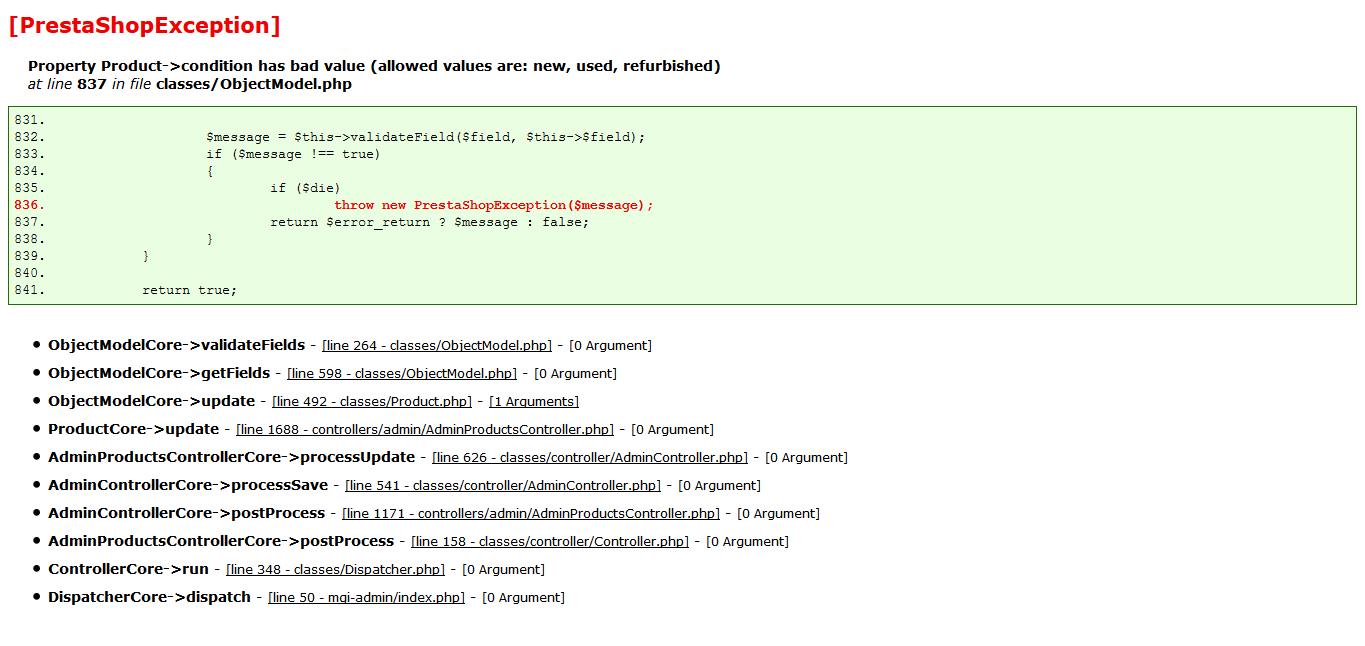 sumitt2004 Posted February 26, 2013 Share Posted February 26, 2013 (edited) Hi, I am trying to add 3 values (hot, sale and offer) in product condition with New, Used and Refurbished. I altered ps_product table with ENUM (new,used,refurbished,hot,sale,offer) and edited information.tpl file to show these values in BO. Now as I save product with any of new value then an error comes with: Property Product->condition has bad value (allowed values are: new, used, refurbished) at line 837 in file classes/ObjectModel.php . Here is the screenshot. Edited April 9, 2013 by sumitt2004 (see edit history) Link to comment Share on other sites More sharing options...