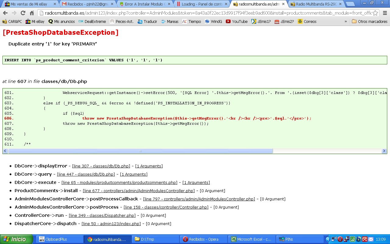 radiosmultibanda Posted May 20, 2013 Share Posted May 20, 2013 Intenta por si las moscas esto. El fichero que te adjunto, descomprimelo en tu ordenador y sube el directorio descomprimido al directorio: /modules/ desde el ftp. Luego, ve a la pestañas modulos -> modulos, y prueba instalarlo. Hola, he hecho lo que me dices y sigue sin quererse cargar. El caso es que creo recordar (aunque ya no estoy seguro) que al principio de instalar ps llegué a cargar el módulo productcomments sin problemas,.pero luego revisando modulos y tal lo quité,..mecachis si lo llego a saber ahora lo hubiera dejado ay. He probado a desinstalar-instalar, por ftp, etc,.. El modulo veo que pone ver. 2.3 ¿es posible que haya una rev. 2.5 o algo así??,.no sé pero como que buscando por google me suena haberlo visto o alomejor lo he soñado tanto darle vueltas,.jaja, .. Link to comment Share on other sites More sharing options...