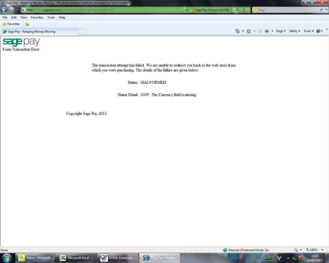 dcman007 Posted March 4, 2013 Share Posted March 4, 2013 Hi, I have installed the SagePay Go module for a client on their site. Normally this has worked fine in the past, but this site fails to process the payment via the SagePay system. I've attached an image of the error I'm getting on the site when working in the production environment. When working in the test environment the sagepay test server isn't redirecting back to the prestashop site, but the order is being logged in Prestashop. The site has is written in Prestashop V1.52.0 Any help is greatly appreciated Link to comment Share on other sites More sharing options...