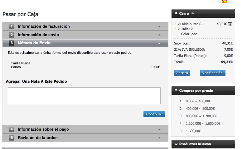 nadie Posted March 4, 2013 Share Posted March 4, 2013 No consigo llegar al paso a las formas de pago. Cuando hago una compra simulada se ñade todo perfectamente al carro y cuando inicio el proceso de compra todo va bien hasta llegar a la selcción de la forma de pago. Actualmente hay posibilidad de transferencia, cheque y contrarrenmbolso. Por más que le doy al botón de continuar desde Método de Envío, no pasa de ahí. Ya no se que hacer me estoy volviendo loco. Gracias por acualquier ayuda. sitio: http://www.balletyflamenco.com Solo he entrado a la home, por que ahora mismo no puedo entrenerme (luego por la noche si tengo un huevo hare la prueba de la compra), pero hay no usas Prestashop usas Tomatocart y esto es un foro de Prestashop. 1 Link to comment Share on other sites More sharing options...
