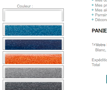 cocoges Posted March 8, 2013 Share Posted March 8, 2013 (edited) Bonjour, Je suis sous PS 1.5.3.1 J'au un produit avec des déclinaisons de type couleur. Chaque valeur correspond à une image de texture. Je souhaite que ces images soit disponible dans un menu déroulant et non en palette car cela prend beaucoup de place. Pouvez vous m'indiquer comment je peux effectuer cette modif ? Cordialement Cocoges Edit : Voici ce que j'ai aujourd'hui. C'est en palette. Je voudrai les mettre en menu déroulant. Dans le menu ce sont des images et non pas du texte. Merci pour vos contributions :-) Edited May 18, 2013 by cocoges (see edit history) Link to comment Share on other sites More sharing options...