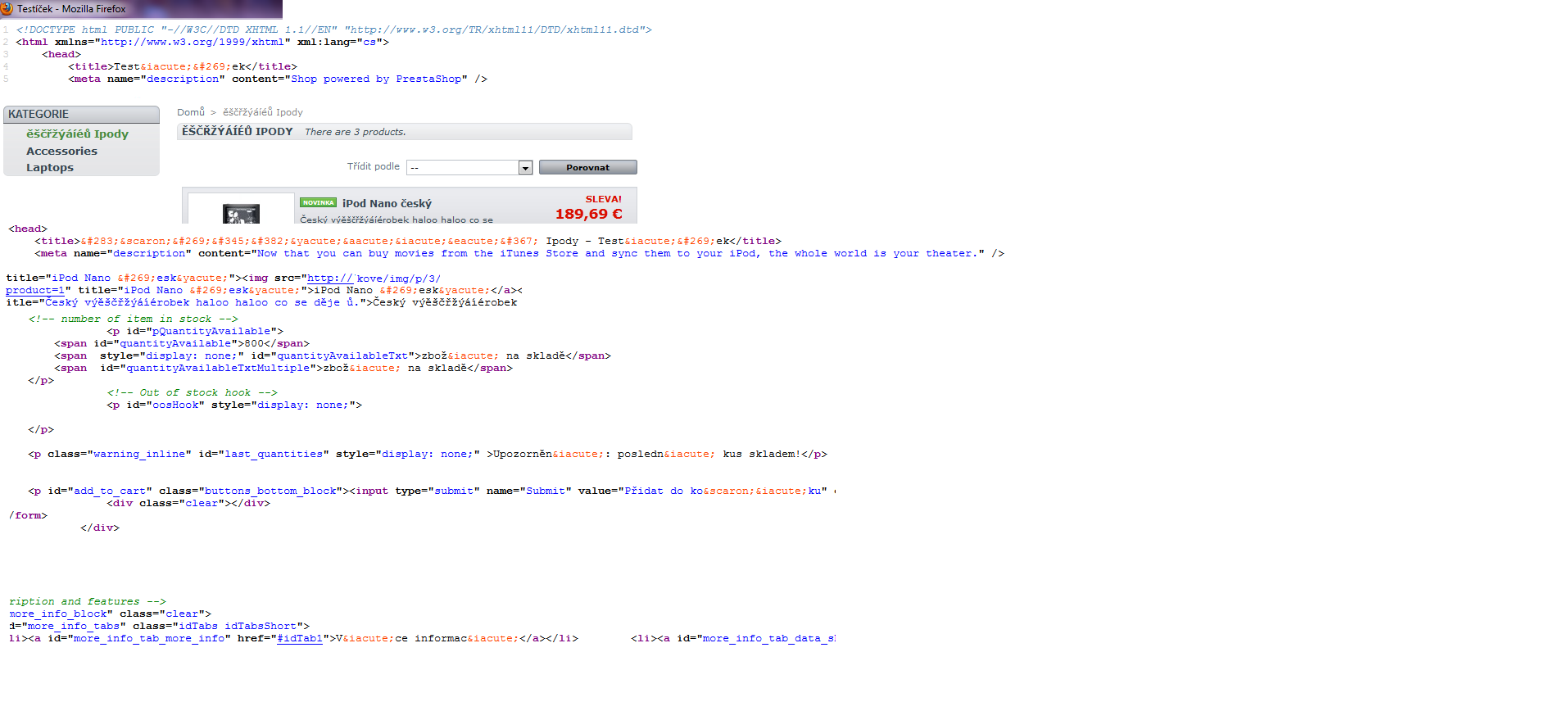 sparhawk Posted March 10, 2013 Author Share Posted March 10, 2013 (edited) Charset on my page is (source code): <!DOCTYPE html PUBLIC "-//W3C//DTD XHTML 1.1//EN" "http://www.w3.org/TR/xhtml11/DTD/xhtml11.dtd"> <html xmlns="cs"> <head> <title>Testíček</title> <meta name="Shop powered by PrestaShop" /> <meta name="shop, prestashop" /> <meta http-equiv="application/xhtml+xml; charset=utf-8" /> <meta name="PrestaShop" /> <meta name="index,follow" /> Edited March 10, 2013 by sparhawk (see edit history) Link to comment Share on other sites More sharing options...