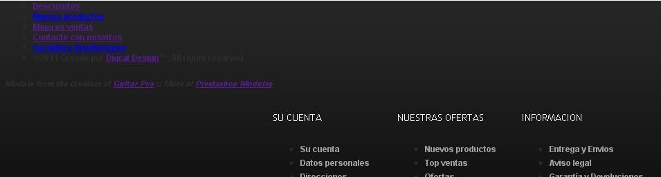 nadie Posted March 10, 2013 Share Posted March 10, 2013 Hola, alguien me puede ayudar ,porque se ve así el footer como duplicado? quiero eliminar La primera parte...no lo encuentro el tpl (solo la 2ª que es la correcta) Ve a la pestaña módulos -> Posiciones Busca el bloque que diga DisplayFooter, y revisa los modulos que tengas hay. (Hay puedes ver el módulo que tienes puesto encima de los otros, apuntate el nombre y luego lo desinstalas de la pestaña Módulos directamente) Por cierto. ¿Dirección de la tienda? Link to comment Share on other sites More sharing options...