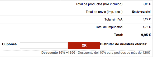 Codino28 Posted March 11, 2013 Share Posted March 11, 2013 Hola. He añadido un descuento por compras superiores a 120€, pero me deja desordenado la línea del descuento, y me la coloca a seguir del cupón descuento. Donde tengo que tocar para que me lo coloque en la siguiente línea??? A mi me queda así: Link to comment Share on other sites More sharing options...