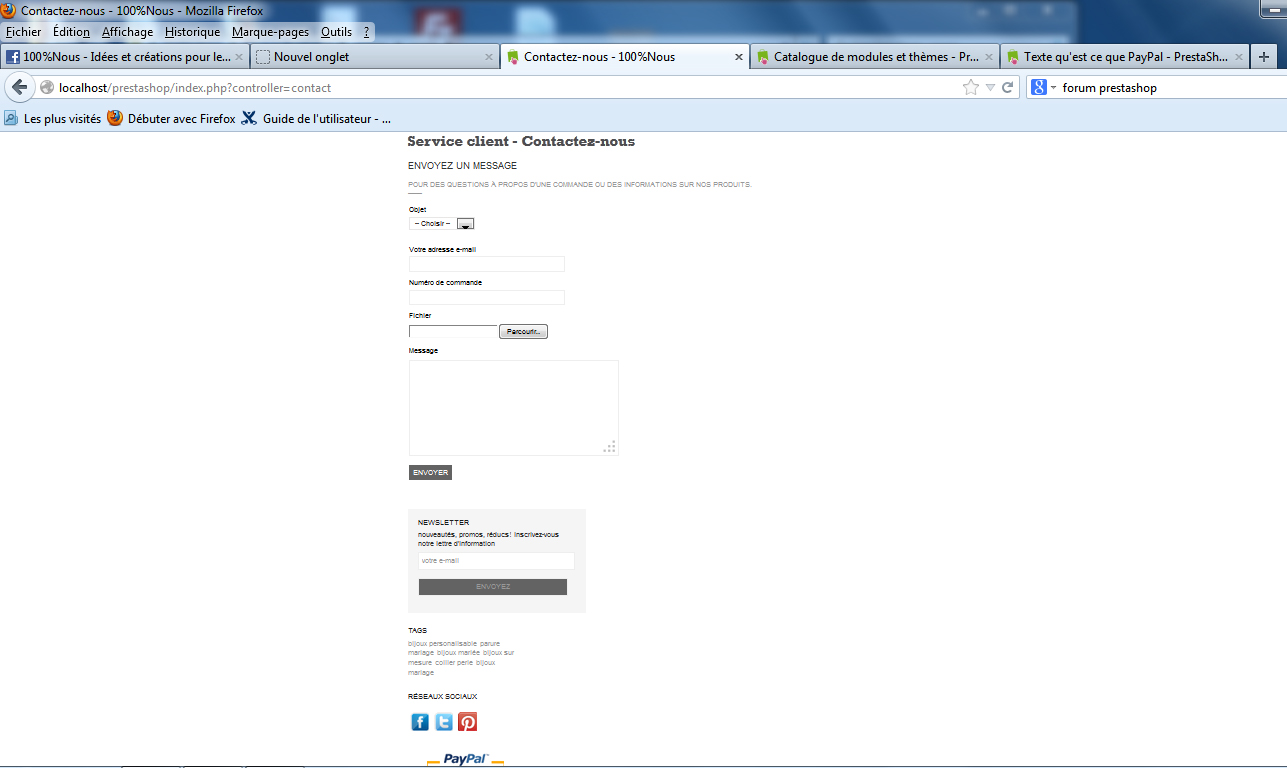 severine69100 Posted March 13, 2013 Author Share Posted March 13, 2013 Bien en fait c'est ma barre de menu qui fait beuger le reste de mon thème qui est Matrice. Donc on a bidouiller un truc avec la barre de menu du thème (qui ne se verra pas mais qui est présente afin de garder la mise en forme) et la barre de megazone qui est visible. Le texte Paypal est alors bien affiché. C'est du bidouillage mais on fais ce que l'on peut. Parcontre ma barre de menu fait beuger le reste des pages, car la column de gauche (comprenant newletter, tag, reseaux ) est déplacée vers le bas lors de l'affichage de la page contact, plan du site et aussi les pages catégorie en photos. Voir photo. Si vous avez une solution, je vous remercirai. Un ami essai de travailler sur la programmation d'un mix des deux barres de menu afin d'éviter ces bugs mais si vous avez une solution hésitez pas. Link to comment Share on other sites More sharing options...