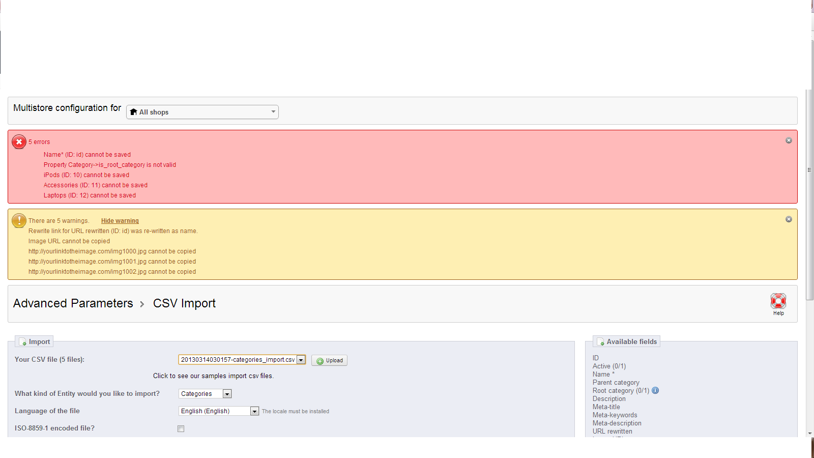 saad89 Posted March 14, 2013 Share Posted March 14, 2013 Ok, as you see i can't import my categories into prestashop, 5 errors Name* (ID: id) cannot be saved Property Category->is_root_category is not valid iPods (ID: 10) cannot be saved Accessories (ID: 11) cannot be saved Laptops (ID: 12) cannot be saved above error when i use their sample file category import, any idea, thanks in advance. Link to comment Share on other sites More sharing options...