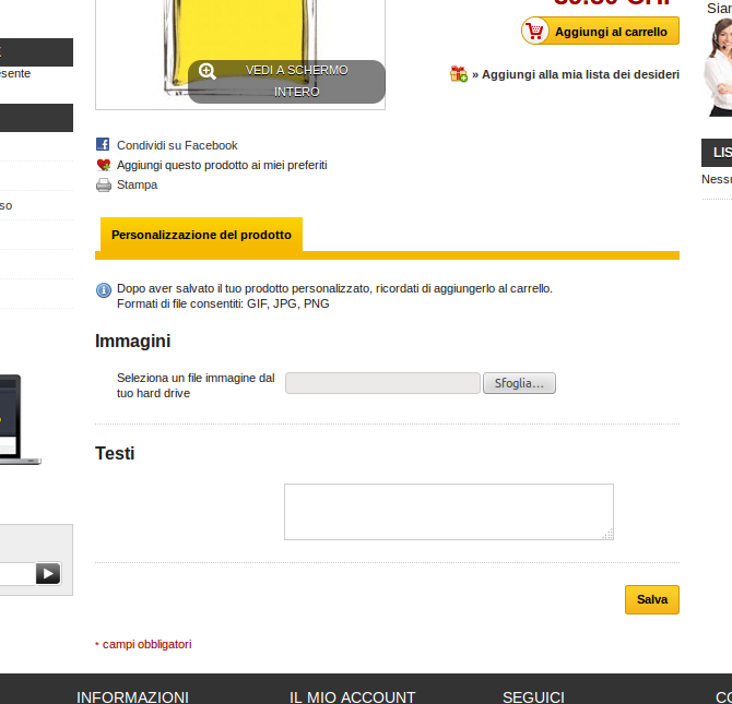 Giogas82 Posted April 6, 2013 Share Posted April 6, 2013 Ciao a tutti, vorrei cancellare il modulo che permette ai clienti di aggiungere immagini per personalizzare un prodotto, solo che non capisco quale modulo devo disinstallare. V 1.5. E' da ore che lo sto cercando inutilmente;(( Grazie Non devi disinstallare nulla ! Vai nel Back Office: Catalogo --> Prodotti Scegli il prodotto in questione Nel menù di sx clicca su "personalizzazione" In quest'area puoi scegliere i "campi di file" e i "campi di testo" da inserire in fondo alla scheda prodotto (servono in pratica al cliente per inserire per es. un testo da stampare su una maglietta oppure un immagine). Se inserisci 0 (zero) in quei campi...non visualizzerai più la "personalizzazione del prodotto" ! Salva e il gioco è fatto ! 1 Link to comment Share on other sites More sharing options...