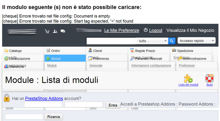 doublebass Posted March 14, 2013 Share Posted March 14, 2013 hallo to you all, i got a new installation of ps, but I have some problems to navigate correctly through the backend menu. see the attachment please. When I click on module item I receive the following errors: [cheque] Errore trovato nel file config: Document is empty [cheque] Errore trovato nel file config: Start tag expected, '<' not found the frontend is ok. Have you an idea to solve my issue? thank you so much Link to comment Share on other sites More sharing options...