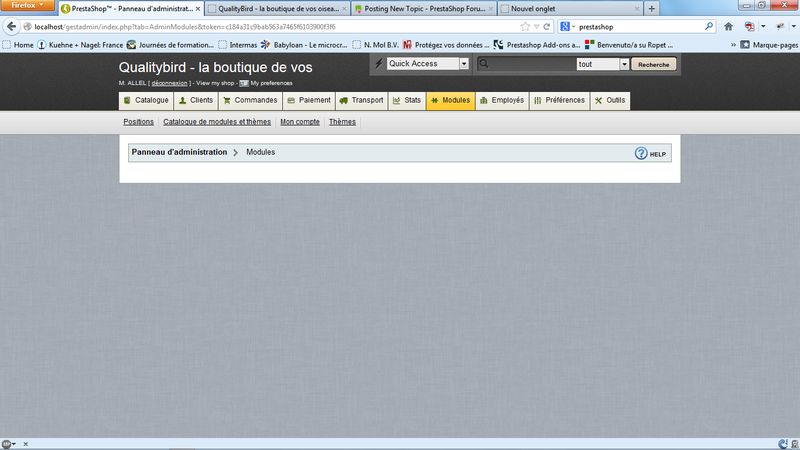 mmomobis Posted March 15, 2013 Share Posted March 15, 2013 (edited) Bonjour, Je viens d'effectuer une mise à jour de la 1.3.7 à la 1.4.10 tout s'est bien passé (je fais ça en local hein), j'ai un problème dans le back office, lorque je clique sur l'onglet module, j'ai une page blanche, aucun module n'est visible (lors de la mise à jour j'ai viré tous les modules non natifs de la 1.4.X....) je mets un screen, si une personne a une idée, car là je sèche, j'ai vidé Smarty, merci d'avance Edited March 22, 2013 by mmomobis (see edit history) Link to comment Share on other sites More sharing options...