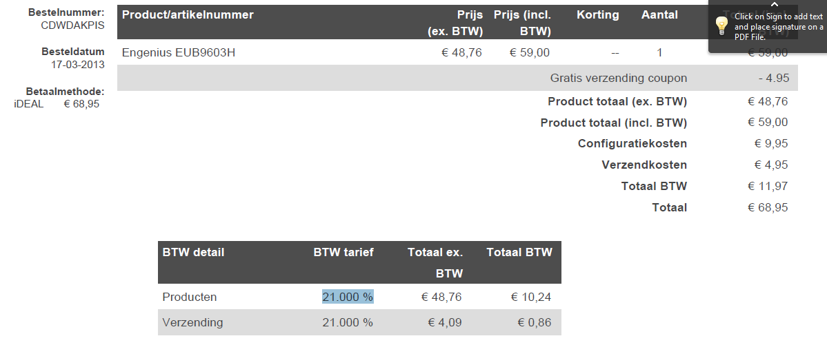 BuB Posted March 17, 2013 Share Posted March 17, 2013 Ik wil een aantal dingen aanpassen op de factuur. Hoe verander ik BTW tarief van 21.000 % naar 21% (de manier waarop dit op de factuur wordt weergegeven. Daarnaast staan producten en verzending keurig gesplitst. De kosten voor cadeauverpakking staan niet bij de BTW, er wordt wel BTW over berekend (ik heb cadeauverpakking verandert naar configuratiekosten, enkel de naam gewijzigd verder geen aanpassingen). Link to comment Share on other sites More sharing options...