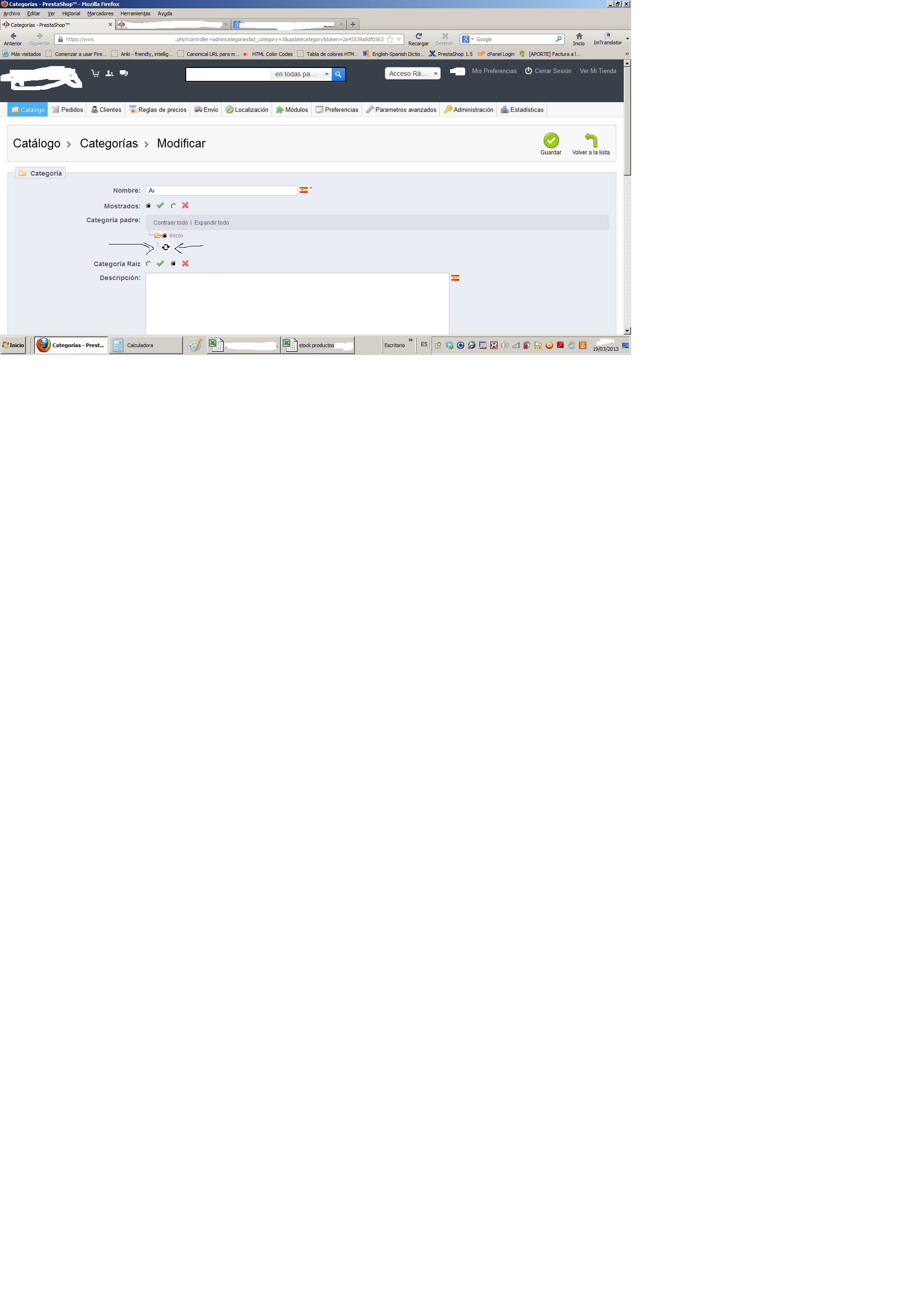 felipvens Posted November 8, 2013 Share Posted November 8, 2013 Buenas tardes, Alguien me puede echar una mano y decirme por qué no se cargan las categorías que tengo definidas en el programa ? Puedo dar de alta un producto sin problema hasta que quiero enlazarlo con una categoría. Seguro que es una cosa muy tonta pero yo no sé qué es. Adjunto screenshot para que veáis de lo que estoy hablando. Agradezco vuestra rápida ayuda para continuar trabajando. Saludos Gema A mi me paso lo mismo y se soluciono borrando la cache Link to comment Share on other sites More sharing options...
