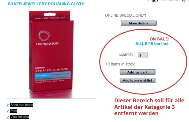 kansas3d Posted March 21, 2013 Share Posted March 21, 2013 (edited) Hallo zusammen, ich würde gerne den Preis und den Warenkorb-Button für eine Kategorie entfernen. Die restlichen kategorien sollten weiterhin die Shop-Funktion behalten das man Artikel kaufen kann. Ich habe bereit folgendes probiert folgenden Code in mein product.tpl einzufügen, das ich im Forum gefunden hatte für meine Prestashop 1.4.9 Version, aber da passiert leider nichts: {if $product->id_category_default != 3} Hier ist der komplette Auszug damit ihr einen Überblick habt an welcher Stelle ich den Code eingefügt habe. Meine Änderungen habe ich mit einem eingeschlossen (ist nur ganz oben und unten eingefügt worden).: [b]<!-- Code start to remove Price for Product ID 3 --> {if $product->id_category_default != 3}[/b] {if ($product->show_price AND !isset($restricted_country_mode)) OR isset($groups) OR $product->reference OR (isset($HOOK_PRODUCT_ACTIONS) && $HOOK_PRODUCT_ACTIONS)} <!-- add to cart form--> <form id="buy_block" {if $PS_CATALOG_MODE AND !isset($groups) AND $product->quantity > 0}class="hidden"{/if} action="{$link->getPageLink('cart.php')}" method="post"> <!-- hidden datas --> <p class="hidden"> <input type="hidden" name="token" value="{$static_token}" /> <input type="hidden" name="id_product" value="{$product->id|intval}" id="product_page_product_id" /> <input type="hidden" name="add" value="1" /> <input type="hidden" name="id_product_attribute" id="idCombination" value="" /> </p> <!-- prices --> {if $product->show_price AND !isset($restricted_country_mode) AND !$PS_CATALOG_MODE} .... <!-- Out of stock hook --> <p id="oosHook"{if $product->quantity > 0} style="display: none;"{/if}> {$HOOK_PRODUCT_OOS} </p> <p class="warning_inline" id="last_quantities"{if ($product->quantity > $last_qties OR $product->quantity <= 0) OR $allow_oosp OR !$product->available_for_order OR $PS_CATALOG_MODE} style="display: none;"{/if} >{l s='Warning: Last items in stock!'}</p> {if $product->online_only} <p>{l s='Online only'}</p> {/if} <p{if (!$allow_oosp && $product->quantity <= 0) OR !$product->available_for_order OR (isset($restricted_country_mode) AND $restricted_country_mode) OR $PS_CATALOG_MODE} style="display: none;"{/if} id="add_to_cart" class="buttons_bottom_block"><input type="submit" name="Submit" value="{l s='Add to cart'}" class="exclusive" /></p> {if isset($HOOK_PRODUCT_ACTIONS) && $HOOK_PRODUCT_ACTIONS}{$HOOK_PRODUCT_ACTIONS}{/if} <div class="clear"></div> </form> {/if} [b]{/if} <!-- Code end to remove Price for Product ID 3 -->[/b] Es wäre schön wenn mir jemand einen Hinweis geben könnte waren das liegt das es nicht funktioniert. Im Foto habe ich nochmal die Stelle markiert die entfernt werden soll für meine Artikel mit der Kategorie 3. Danke euch Edited March 21, 2013 by kansas3d (see edit history) Link to comment Share on other sites More sharing options...
