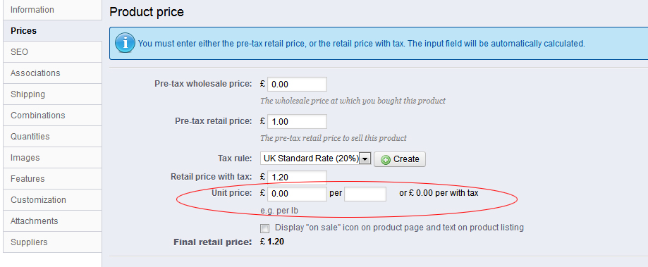 carmy Posted March 22, 2013 Author Share Posted March 22, 2013 I created the product, I clicked on prices in the left column, insert the purchase price, the sale price, but I can not find the "unit price". Help Link to comment Share on other sites More sharing options...