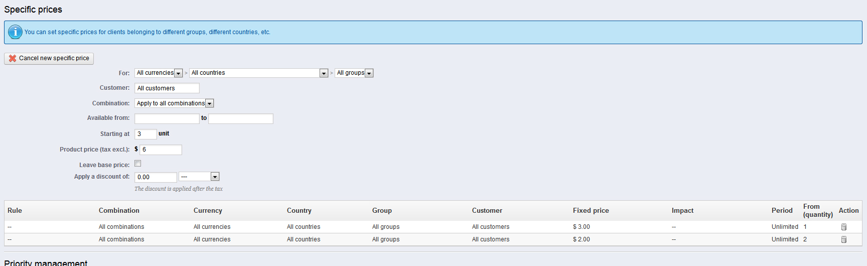 carmy Posted March 22, 2013 Share Posted March 22, 2013 (edited) [sOLVED] Hi all, I installed the version of Prestashop 1.5.3.1. I do not know if it is possible. I would like to change the price of a product based on the amount chosen by the customer. Prestashop default doubles the price. Instead, I would like to have the possibility of increasing the price of N based on the quantity selected by the customer. I hope I was clear. Do you think you can do such a thing? Sorry for my english Thanks in advance. Edited March 22, 2013 by carmy (see edit history) Link to comment Share on other sites More sharing options...