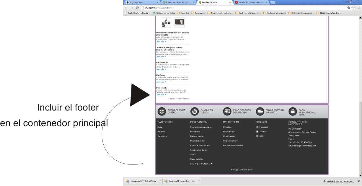 Mi pregunta es simple. Como puedo mover la el menu horizontal superior (blocktopmenu) al contenedor principal de la página. También integrar el footer en el contenedor principal. Aquí les dejo las imagenes.