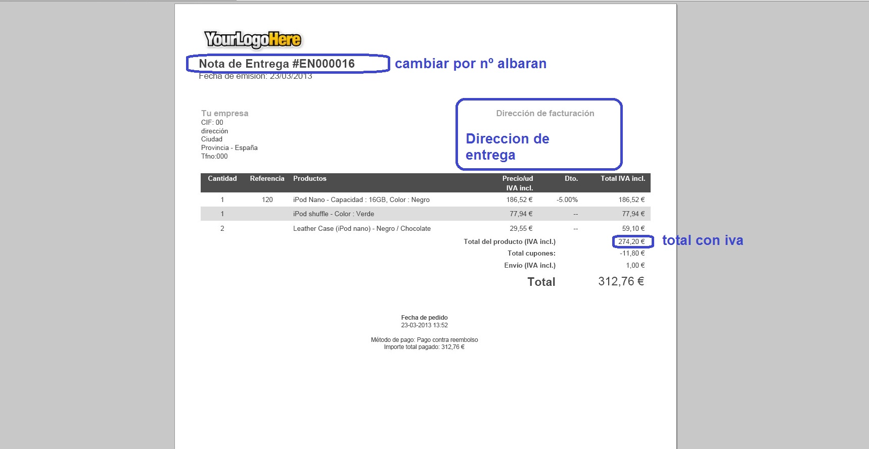 Trade1 Posted March 25, 2013 Share Posted March 25, 2013 Hola. Estoy modificando el albarán PDF para añadir más información y necesito vuestra ayuda. 1-Quiero cambiar nota de entrega por Albaran nº (referencia albarán ò numero albarán). 2-Añadir dirección de entrega a la derecha y dirección de facturacin a la izquierda. 3-He cambiado los importes para que aparezcan con IVA incluido, pero no consigo cambiar el importe Total del producto. Gracias antemano. Link to comment Share on other sites More sharing options...