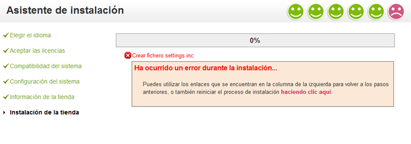 franmille Posted April 4, 2013 Author Share Posted April 4, 2013 ¿Funciona o no? Buenas, no me funciona. He cambiado ambos ficheros y si que he conseguido pasar el test de compatibilidad del sistema, pero en la parte de instalación me salta el fallo que adjunto, el cual dice que ha ocurrido un error al crear el fichero settings.inc Sin embargo lo crea perfectamente. Me puedes ayudar? Link to comment Share on other sites More sharing options...