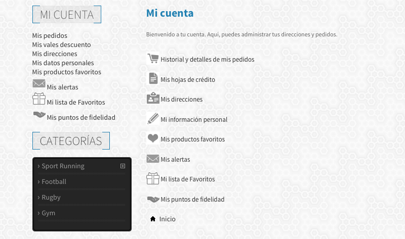 El problema viene cuando se añaden nuevos módulos al presta... tales como el wishlist, puntos de fidelidad o mis alertas... que añaden un enlace al módulo MY account.