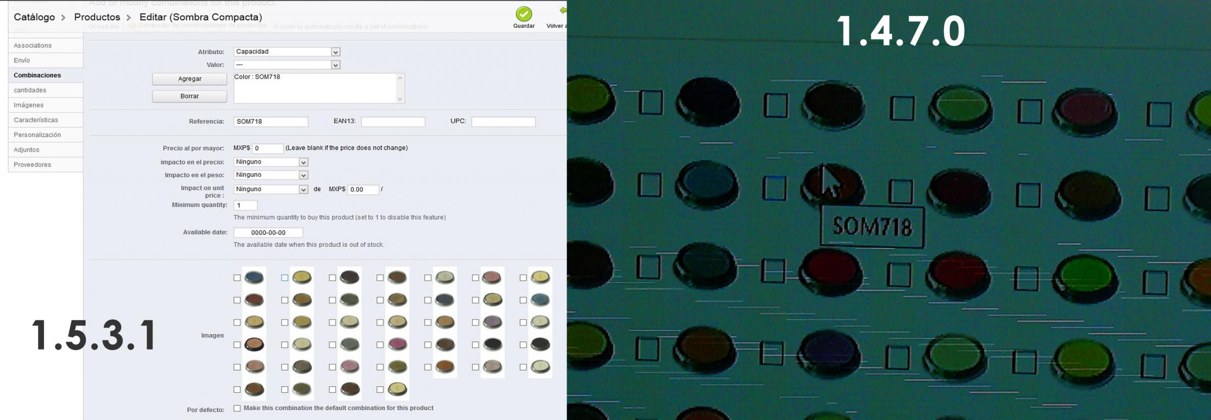 ipow Posted March 28, 2013 Share Posted March 28, 2013 (edited) Buenas aca con una duda de la sección de combinaciones de los productos, sucede que en la version 1.4.7.0 cuando selecciono la imagen correspondiente a la combinacion que estoy realizando cuando paso el mouse encima de la imagen me muestra el nombre o referencia a ese archivo, cuando me actualizo a la versión 1.5.3.1 esta funcionalidad ya no esta disponible, saben uds si es por algo que tenga que configurar o simpelemente eso lo retirarón de las siguientes versiones, ayudaba bastante para ir identificando cada imagen cuando son muchas las combinaciones a realizar. Ojala y exista una forma de volver a activarlo y me puedan ayudar. Desde ya gracias David PD: ahi disculpen la calidad de la imagen. Edited March 28, 2013 by ipow (see edit history) Link to comment Share on other sites More sharing options...