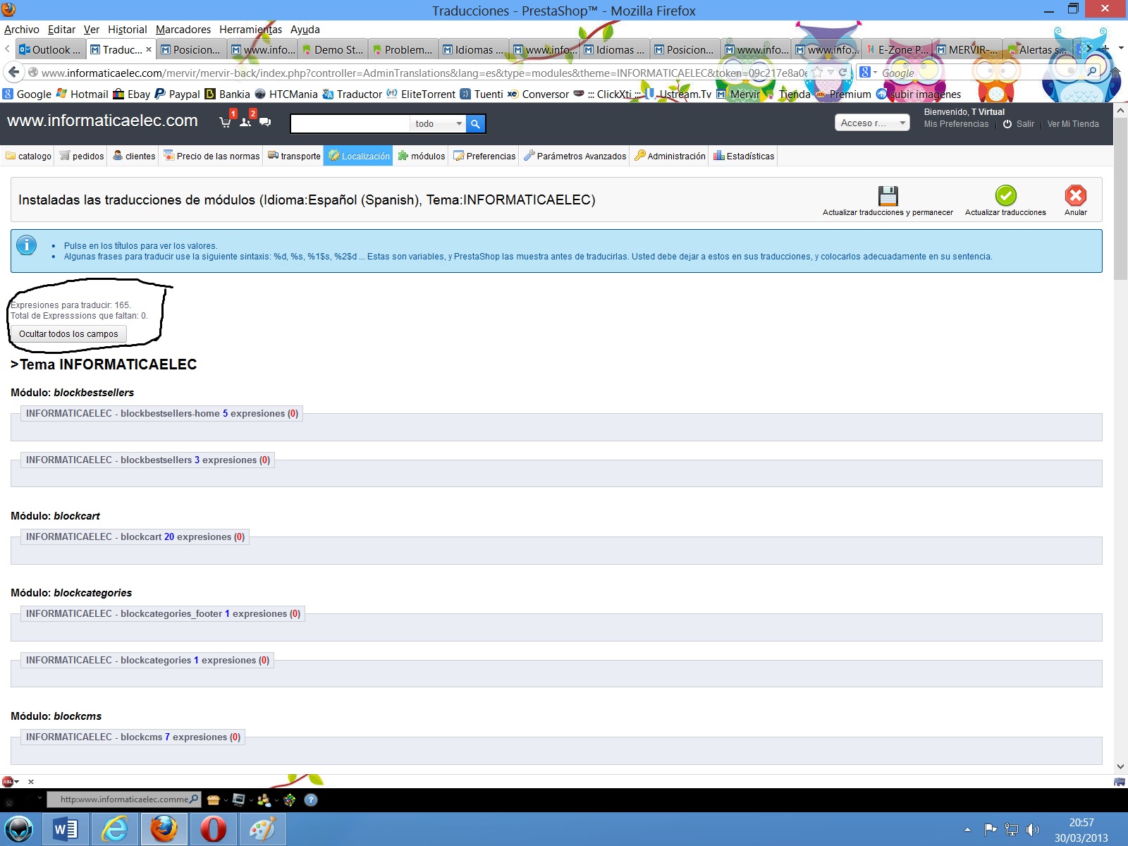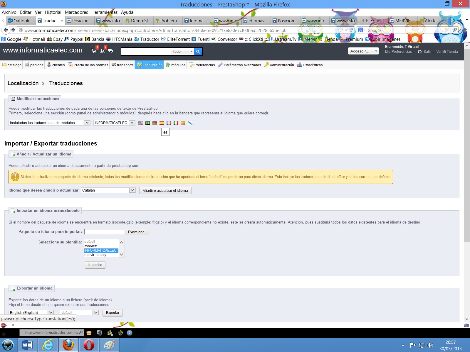 nadie Posted March 30, 2013 Share Posted March 30, 2013 Si, está todo traducido, que raro... Voy a ver el archivo que comentas Nadie. Muchísimas gracias!!!! No me deja subir el archivo aquí al post... pone un error: "You aren't permitted to upload this kind of file" Te indico lo que pone dentro de ese archivo: Muchísimas Gracias Saludos Compañeros {* * 2007-2012 PrestaShop * * NOTICE OF LICENSE * * This source file is subject to the Academic Free License (AFL 3.0) * that is bundled with this package in the file LICENSE.txt. * It is also available through the world-wide-web at this URL: * http://opensource.or...ses/afl-3.0.php * If you did not receive a copy of the license and are unable to * obtain it through the world-wide-web, please send an email * to [email protected] so we can send you a copy immediately. * * DISCLAIMER * * Do not edit or add to this file if you wish to upgrade PrestaShop to newer * versions in the future. If you wish to customize PrestaShop for your * needs please refer to http://www.prestashop.com for more information. * * @author PrestaShop SA <[email protected]> * @copyright 2007-2012 PrestaShop SA * @version Release: $Revision: 7471 $ * @license http://opensource.or...ses/afl-3.0.php Academic Free License (AFL 3.0) * International Registered Trademark & Property of PrestaShop SA *} <!-- Block permanent links module HEADER --> <ul id="header_links"> <li id="header_link_contact"><a href="{$link->getPageLink('contact', true)}" title="{l s='contact' mod='blockpermanentlinks'}">{l s='contact' mod='blockpermanentlinks'}</a></li> <li id="header_link_sitemap"><a href="{$link->getPageLink('sitemap')}" title="{l s='sitemap' mod='blockpermanentlinks'}">{l s='sitemap' mod='blockpermanentlinks'}</a></li> <li id="header_link_bookmark"> <script type="text/javascript">writeBookmarkLink('{$come_from}', '{$meta_title|addslashes|addslashes}', '{l s='bookmark' mod='blockpermanentlinks'}');</script> </li> <li id="your_account"><a href="{$link->getPageLink('my-account', true)}" title="{l s='Your Account' mod='blockpermanentlinks'}">{l s='Your Account' mod='blockpermanentlinks'}</a></li> <li id="header_user_info"> {l s='Welcome' mod='blockpermanentlinks'} {if $logged} <a href="{$link->getPageLink('my-account', true)}" class="account"><span>{$cookie->customer_firstname} {$cookie->customer_lastname}</span></a> <a href="{$link->getPageLink('index', true, NULL, "mylogout")}" title="{l s='Log me out' mod='blockpermanentlinks'}" class="logout">{l s='Log out' mod='blockpermanentlinks'}</a> {else} <a href="{$link->getPageLink('my-account', true)}" class="login">{l s='Log in' mod='blockpermanentlinks'}</a> {/if} </li> </ul> <!-- /Block permanent links module HEADER --> Ok, pues vamos por las tres palabras que no puedes traducir: "Welcome" Log In y Your Account en el codigo que me has pasado busca esto: <li id="your_account"><a href="{$link->getPageLink('my-account', true)}" title="{l s='Your Account' mod='blockpermanentlinks'}">{l s='Your Account' mod='blockpermanentlinks'}</a></li> y dejalo asi: <li id="your_account"><a href="{$link->getPageLink('my-account', true)}" title="{l s='Palabra Clavex' mod='blockpermanentlinks'}">{l s='Palabra Clavex' mod='blockpermanentlinks'}</a></li> Luego busca en el panel de tu tienda en la pestaña Localizacion -> Traducciones -> Traducciones de los módulos y dime si te deja traducir la "Palabra Clavex" Busca en el fichero esto tambien: {l s='Welcome' mod='blockpermanentlinks'} y dejalo asi: {l s='PalabraClaveBienvenido' mod='blockpermanentlinks'} Luego busca en el panel de tu tienda en la pestaña Localizacion -> Traducciones -> Traducciones de los módulos y dime si te deja traducir la "PalabraClaveBienvenido" Busca tambien el fichero esto: {l s='Log in' mod='blockpermanentlinks'} y dejalo asi: {l s='PalabraClaveLogin' mod='blockpermanentlinks'} Luego busca en el panel de tu tienda en la pestaña Localizacion -> Traducciones -> Traducciones de los módulos y dime si te deja traducir la "PalabraClaveLogin" Link to comment Share on other sites More sharing options...