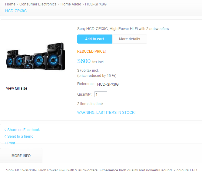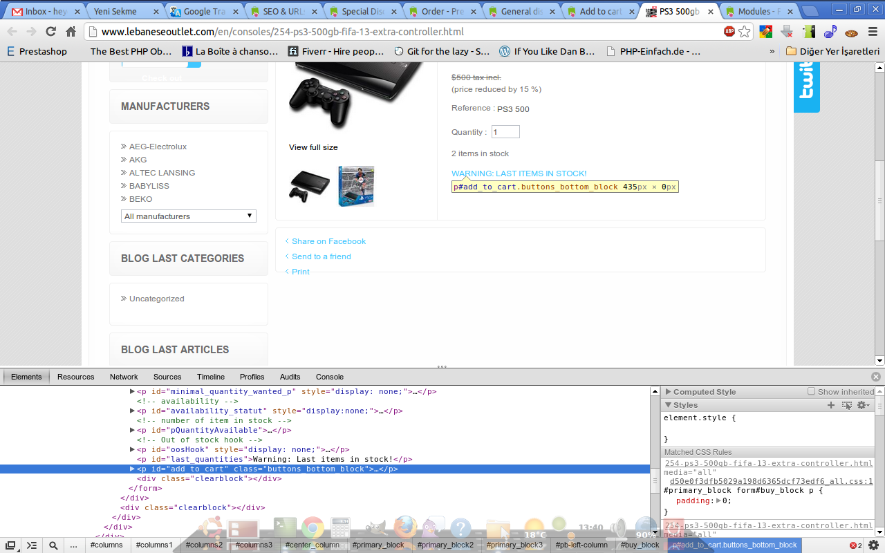 leboutlet Posted March 30, 2013 Share Posted March 30, 2013 Hello, the "Add to Cart" button suddenly disappeared from only a few items of the catalog after I set a discount on them. They have the same available quantities as other products. They have a price reduction too. But the button is missing. I suspect the issue to be with the them? Maybe there is not enough space in the box? But the add to cart button is at the top, it loads before the description or the price. so I am not sure. 2 examples below: http://www.lebaneseoutlet.com/en/consoles/254-ps3-500gb-fifa-13-extra-controller.html http://www.lebaneseoutlet.com/en/home-audio/187-hcd-gpx8g.html Anybody faced this? Link to comment Share on other sites More sharing options...