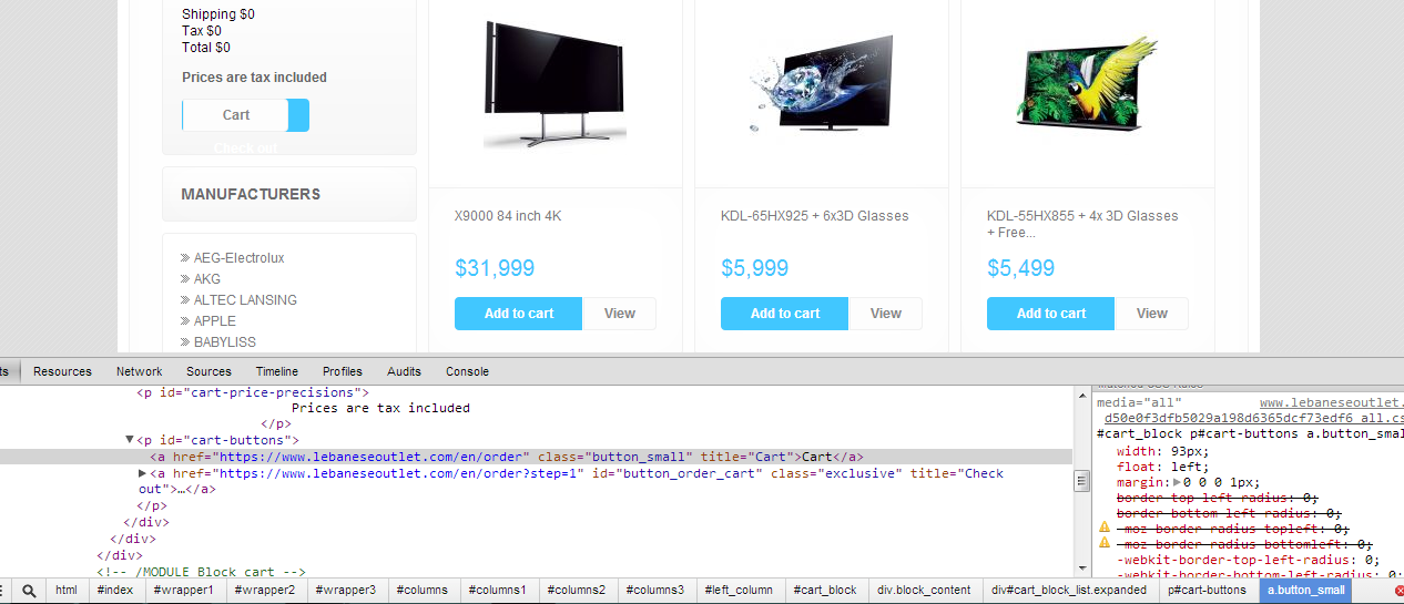 leboutlet Posted April 1, 2013 Author Share Posted April 1, 2013 (edited) Thank you for the advice: Check out the code, it is already "button small" ???? {/if} <p id="cart-buttons"> {if $order_process == 'order'}<a href="{$link->getPageLink(" $order_process.php",="" true)}"="" class="button_mini" title="{l s='Cart' mod='blockcart'}">{l s='Cart' mod='blockcart'}</a>{/if} <a href="{$link->getPageLink(" $order_process.php",="" true)}{if="" $order_process="=" 'order'}?step="1{/if}"" id="button_order_cart" class="button_small{if $order_process == 'order-opc'}_large{/if}" title="{l s='Check out' mod='blockcart'}">{l s='Check out' mod='blockcart'}</a> </p> Edited April 1, 2013 by leboutlet (see edit history) Link to comment Share on other sites More sharing options...