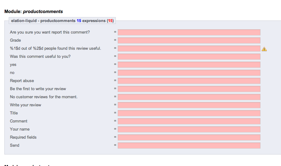 fixgear Posted April 2, 2013 Author Share Posted April 2, 2013 yes, i know but when i go to the product comments module in bo and click configure and then click manage translations (the spanish flag) all i get is the attached error. i know i translated the word "comments" to "reseñas" somewhere but i cannot recall where. in what file would i find these translations to do it manually as the error suggests? i mean when i change the english text to "Customer Reviews", where is that created on my server so i can go translate it without having to use bo to do so? thanks, jer... Link to comment Share on other sites More sharing options...