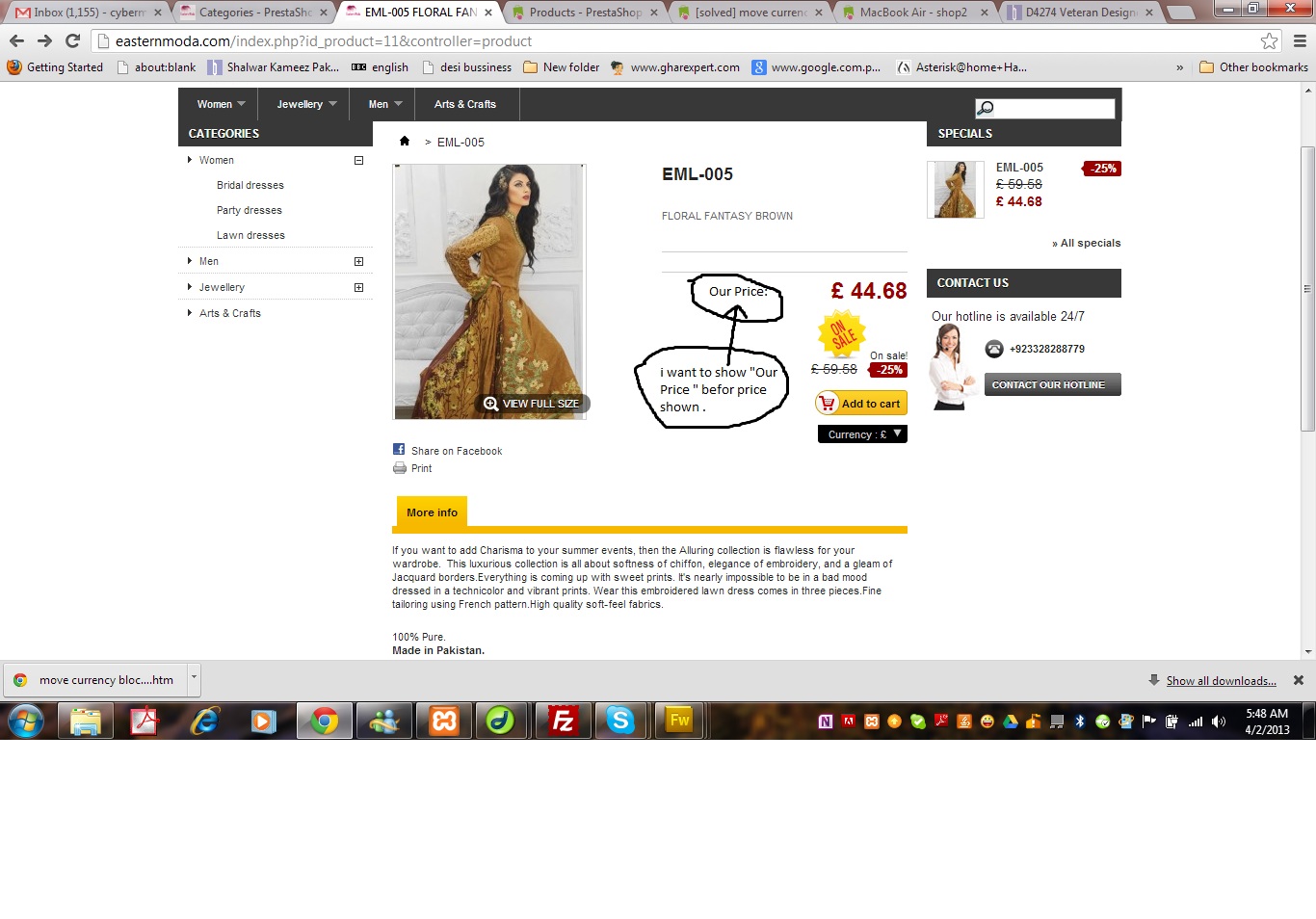 cyberman Posted April 2, 2013 Share Posted April 2, 2013 i want to show "Our Price" string before Product price in product page . screen shot is attached for better understand , also find code of product.tpl kindly help . {* * 2007-2012 PrestaShop * * NOTICE OF LICENSE * * This source file is subject to the Academic Free License (AFL 3.0) * that is bundled with this package in the file LICENSE.txt. * It is also available through the world-wide-web at this URL: * http://opensource.org/licenses/afl-3.0.php * If you did not receive a copy of the license and are unable to * obtain it through the world-wide-web, please send an email * to [email protected] so we can send you a copy immediately. * * DISCLAIMER * * Do not edit or add to this file if you wish to upgrade PrestaShop to newer * versions in the future. If you wish to customize PrestaShop for your * needs please refer to http://www.prestashop.com for more information. * * @author PrestaShop SA <[email protected]> * @copyright 2007-2012 PrestaShop SA * @license http://opensource.org/licenses/afl-3.0.php Academic Free License (AFL 3.0) * International Registered Trademark & Property of PrestaShop SA *} {include file="$tpl_dir./errors.tpl"} {if $errors|@count == 0} <script type="text/javascript"> // <![CDATA[ // PrestaShop internal settings var currencySign = '{$currencySign|html_entity_decode:2:"UTF-8"}'; var currencyRate = '{$currencyRate|floatval}'; var currencyFormat = '{$currencyFormat|intval}'; var currencyBlank = '{$currencyBlank|intval}'; var taxRate = {$tax_rate|floatval}; var jqZoomEnabled = {if $jqZoomEnabled}true{else}false{/if}; //JS Hook var oosHookJsCodeFunctions = new Array(); // Parameters var id_product = '{$product->id|intval}'; var productHasAttributes = {if isset($groups)}true{else}false{/if}; var quantitiesDisplayAllowed = {if $display_qties == 1}true{else}false{/if}; var quantityAvailable = {if $display_qties == 1 && $product->quantity}{$product->quantity}{else}0{/if}; var allowBuyWhenOutOfStock = {if $allow_oosp == 1}true{else}false{/if}; var availableNowValue = '{$product->available_now|escape:'quotes':'UTF-8'}'; var availableLaterValue = '{$product->available_later|escape:'quotes':'UTF-8'}'; var productPriceTaxExcluded = {$product->getPriceWithoutReduct(true)|default:'null'} - {$product->ecotax}; var reduction_percent = {if $product->specificPrice AND $product->specificPrice.reduction AND $product->specificPrice.reduction_type == 'percentage'}{$product->specificPrice.reduction*100}{else}0{/if}; var reduction_price = {if $product->specificPrice AND $product->specificPrice.reduction AND $product->specificPrice.reduction_type == 'amount'}{$product->specificPrice.reduction|floatval}{else}0{/if}; var specific_price = {if $product->specificPrice AND $product->specificPrice.price}{$product->specificPrice.price}{else}0{/if}; var product_specific_price = new Array(); {foreach from=$product->specificPrice key='key_specific_price' item='specific_price_value'} product_specific_price['{$key_specific_price}'] = '{$specific_price_value}'; {/foreach} var specific_currency = {if $product->specificPrice AND $product->specificPrice.id_currency}true{else}false{/if}; var group_reduction = '{$group_reduction}'; var default_eco_tax = {$product->ecotax}; var ecotaxTax_rate = {$ecotaxTax_rate}; var currentDate = '{$smarty.now|date_format:'%Y-%m-%d %H:%M:%S'}'; var maxQuantityToAllowDisplayOfLastQuantityMessage = {$last_qties}; var noTaxForThisProduct = {if $no_tax == 1}true{else}false{/if}; var displayPrice = {$priceDisplay}; var productReference = '{$product->reference|escape:'htmlall':'UTF-8'}'; var productAvailableForOrder = {if (isset($restricted_country_mode) AND $restricted_country_mode) OR $PS_CATALOG_MODE}'0'{else}'{$product->available_for_order}'{/if}; var productShowPrice = '{if !$PS_CATALOG_MODE}{$product->show_price}{else}0{/if}'; var productUnitPriceRatio = '{$product->unit_price_ratio}'; var idDefaultImage = {if isset($cover.id_image_only)}{$cover.id_image_only}{else}0{/if}; var stock_management = {$stock_management|intval}; {if !isset($priceDisplayPrecision)} {assign var='priceDisplayPrecision' value=2} {/if} {if !$priceDisplay || $priceDisplay == 2} {assign var='productPrice' value=$product->getPrice(true, $smarty.const.NULL, $priceDisplayPrecision)} {assign var='productPriceWithoutReduction' value=$product->getPriceWithoutReduct(false, $smarty.const.NULL)} {elseif $priceDisplay == 1} {assign var='productPrice' value=$product->getPrice(false, $smarty.const.NULL, $priceDisplayPrecision)} {assign var='productPriceWithoutReduction' value=$product->getPriceWithoutReduct(true, $smarty.const.NULL)} {/if} var productPriceWithoutReduction = '{$productPriceWithoutReduction}'; var productPrice = '{$productPrice}'; // Customizable field var img_ps_dir = '{$img_ps_dir}'; var customizationFields = new Array(); {assign var='imgIndex' value=0} {assign var='textFieldIndex' value=0} {foreach from=$customizationFields item='field' name='customizationFields'} {assign var="key" value="pictures_`$product->id`_`$field.id_customization_field`"} customizationFields[{$smarty.foreach.customizationFields.index|intval}] = new Array(); customizationFields[{$smarty.foreach.customizationFields.index|intval}][0] = '{if $field.type|intval == 0}img{$imgIndex++}{else}textField{$textFieldIndex++}{/if}'; customizationFields[{$smarty.foreach.customizationFields.index|intval}][1] = {if $field.type|intval == 0 && isset($pictures.$key) && $pictures.$key}2{else}{$field.required|intval}{/if}; {/foreach} // Images var img_prod_dir = '{$img_prod_dir}'; var combinationImages = new Array(); {if isset($combinationImages)} {foreach from=$combinationImages item='combination' key='combinationId' name='f_combinationImages'} combinationImages[{$combinationId}] = new Array(); {foreach from=$combination item='image' name='f_combinationImage'} combinationImages[{$combinationId}][{$smarty.foreach.f_combinationImage.index}] = {$image.id_image|intval}; {/foreach} {/foreach} {/if