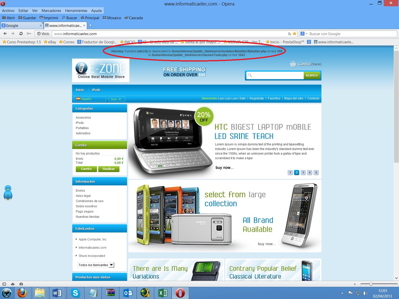 Informaticaelec.com Posted April 2, 2013 Share Posted April 2, 2013 (edited) Hola buenos días, os comento, he echo estos pasos de este gran tutorial de Nadie: http://www.prestasho...-en-prestashop/ Y la verdad que no lo se si es por eso... pero ahora que he ido a mirar la web, sale este error... La verdad que no tengo ni idea porque no he tocado nada desde ayer y funcionaba perfectamente ayer hasta ultimas horas de la noche. Parece que es el modulo de Flytweeter, pero es que iba perfectamente... no tengo ni idea de verdad.... Alguien me puede aconsejar que puedo hacer? Saludos Y Gracias De Antemano!!! El error que me sale al pinchar el producto es este: Warning: Function addJS() is deprecated in /home/informa2/public_html/mervir/modules/flytwitter/flytwitter.php on line 168 in /home/informa2/public_html/mervir/classes/Tools.php on line 1843 Fatal error: Function name must be a string in /home/informa2/public_html/mervir/tools/smarty/sysplugins/smarty_internal_templatebase.php on line 281 Edited April 2, 2013 by Informaticaelec.com (see edit history) Link to comment Share on other sites More sharing options...