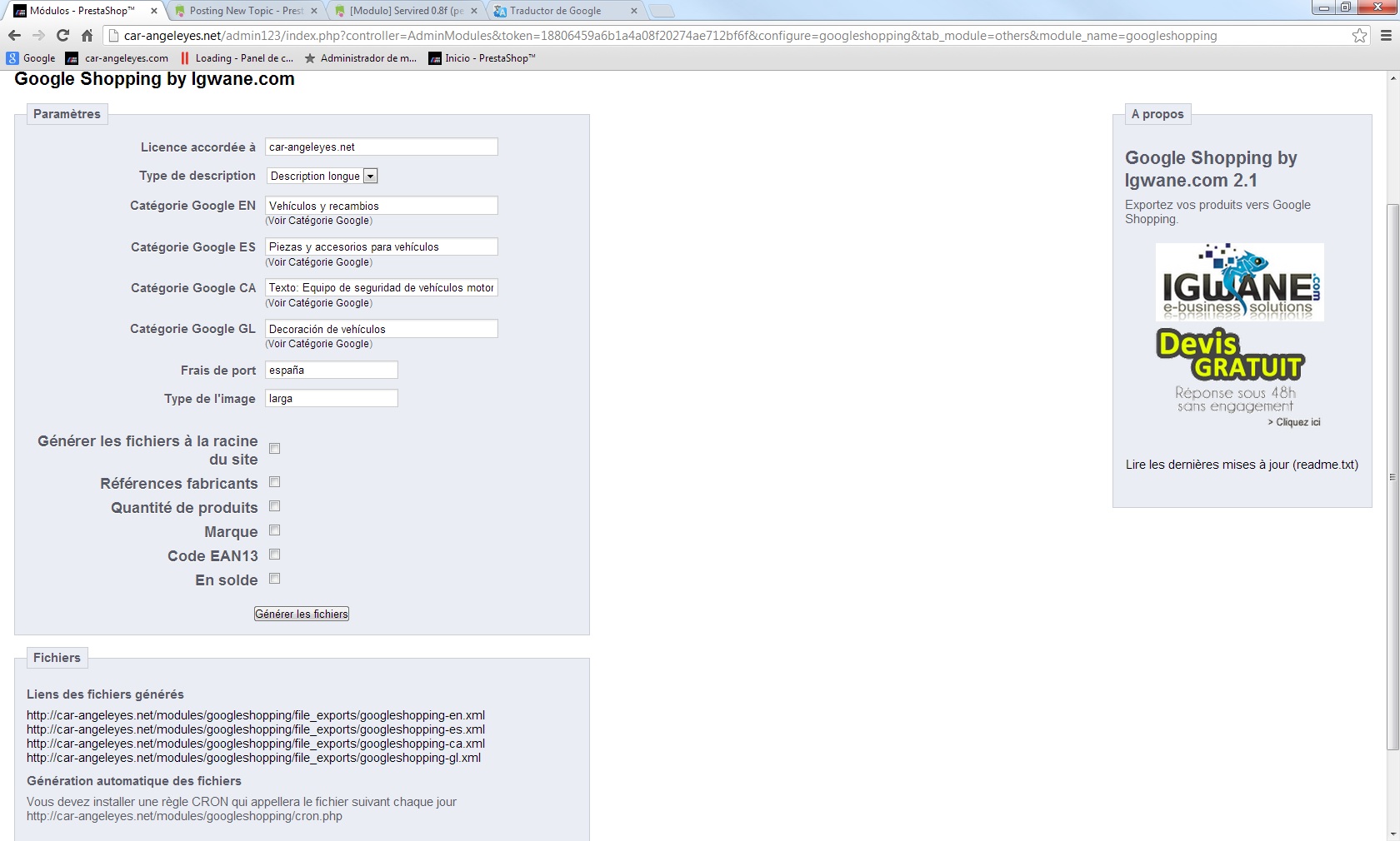 salud marco Posted April 3, 2013 Share Posted April 3, 2013 (edited) hola hace unos dias baje el modulo Google Shopping gratuito pero me es imposible realizar que funcione pongo foto de la configuración y del fallo que me da , a ver si podéis ayudarme alguno . gracias de antemano Edited April 3, 2013 by salud marco (see edit history) Link to comment Share on other sites More sharing options...