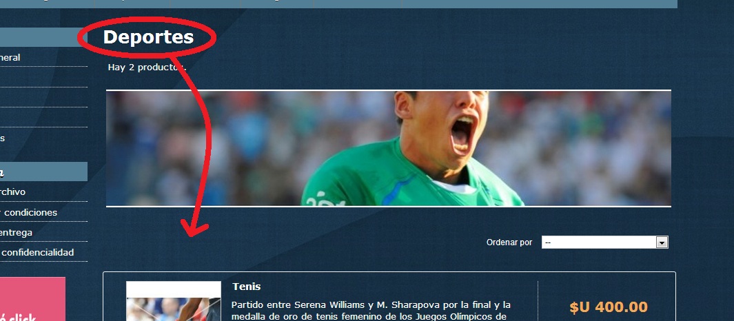 nadie Posted April 4, 2013 Share Posted April 4, 2013 Hola, me gustaría saber si es posible mover el titulo de la categoría, en mi caso quisiera ponerlo debajo de la imagen. Adjunto imagen como ejemplo Si alguien sabe como hacerlo agradezco la ayuda ! Edita el fichero: http://af.diarioelpais.com/themes/default/category.tpl Busca esto: <h1> {strip} {$category->name|escape:'htmlall':'UTF-8'} {if isset($categoryNameComplement)} {$categoryNameComplement|escape:'htmlall':'UTF-8'} {/if} {/strip} </h1> y dejalo debajo de esto: {if $scenes || $category->description || $category->id_image} <div class="content_scene_cat"> {if $scenes} <!-- Scenes --> {include file="$tpl_dir./scenes.tpl" scenes=$scenes} {else} <!-- Category image --> {if $category->id_image} <td width="745"> <div class="align_center"> <img src="{$link->getCatImageLink($category->link_rewrite, $category->id_image, 'category_default')}" alt="{$category->name|escape:'htmlall':'UTF-8'}" title="{$category->name|escape:'htmlall':'UTF-8'}" id="categoryImage" width="{$categorySize.width}" height="{$categorySize.height}" /> </div> {/if} {/if} {if $category->description} <div class="cat_desc"> {if strlen($category->description) > 120} <p id="category_description_short">{$category->description|truncate:120}</p> <p id="category_description_full" style="display:none">{$category->description}</p> <a href="#" onclick="$('#category_description_short').hide(); $('#category_description_full').show(); $(this).hide(); return false;" class="lnk_more">{l s='More'}</a> {else} <p>{$category->description}</p> {/if} </div> {/if} </div> {/if} Link to comment Share on other sites More sharing options...
