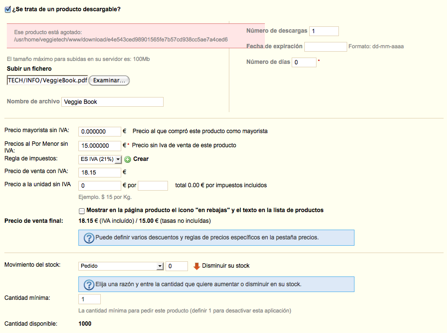 renamed_account_285029 Posted April 10, 2013 Share Posted April 10, 2013 Hola a todos, Espero que me podáis ayudar estoy intentando subir un archivo pdf como producto descargable y me da el siguiente error: Ese producto está agotado: /usr/home/dominio/www/download/64d2234901404a21f343f394d153b61537e7cc61 Adjunto imagen y espero que alguien me pueda ayudar. Muchas gracias de antemano. Link to comment Share on other sites More sharing options...