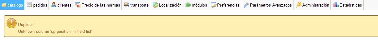 AlmeraGTI Posted April 10, 2013 Share Posted April 10, 2013 (edited) Hola he instalado prestashop 1.5.4 ya 3 veces. y me sale este error cada vez que borro alguna categoría que ya no necesito, en el Tab de productos me sale este error: Duplicar Unknown column 'cp.position' in 'field list' y no puedo ver los productos como listado normalmente pero si puedo buscar los !! básicamente importo un CSV de productos y sale todo bien, pero me lo pone en (Inicio) desde ahí yo coloco los productos en la categorías necesarias o los muevo a la subcategoria necesaria a dentro de la categoria, Desde aquí todo bien, pero cuando borro alguna categoria que ya no necesito y no tiene producto me sale el error de arriba y no puedo ver los productos en el "tab Productos" por que me sale este error. Porfa que alguien me ayude con esto, que me esta volviendo loco Un Saludo Edited April 10, 2013 by AlmeraGTI (see edit history) Link to comment Share on other sites More sharing options...